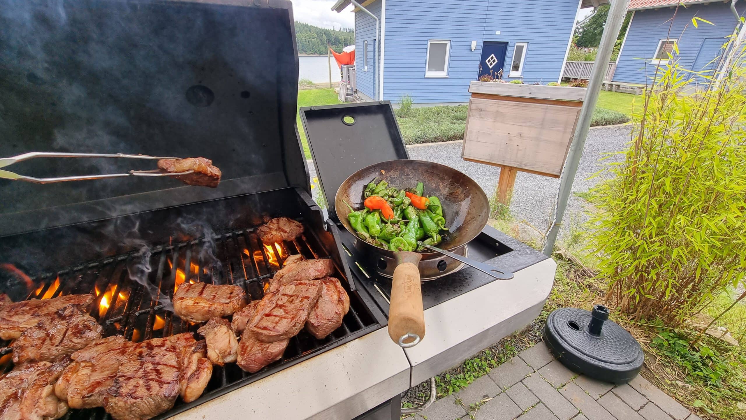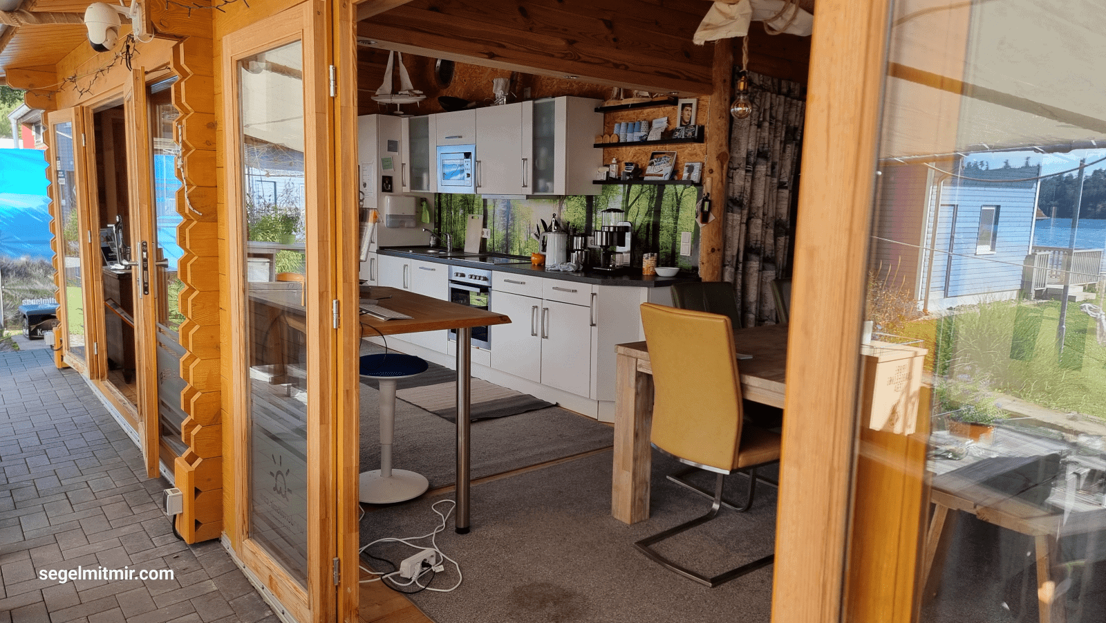 Die überdachte Terrasse bietet ausreichend Platz für eine Vielzahl von Veranstaltungen und Workshops. Besonders praktisch ist die Außenküche mit Kühlschrank und verschiedenen Grillmöglichkeiten.